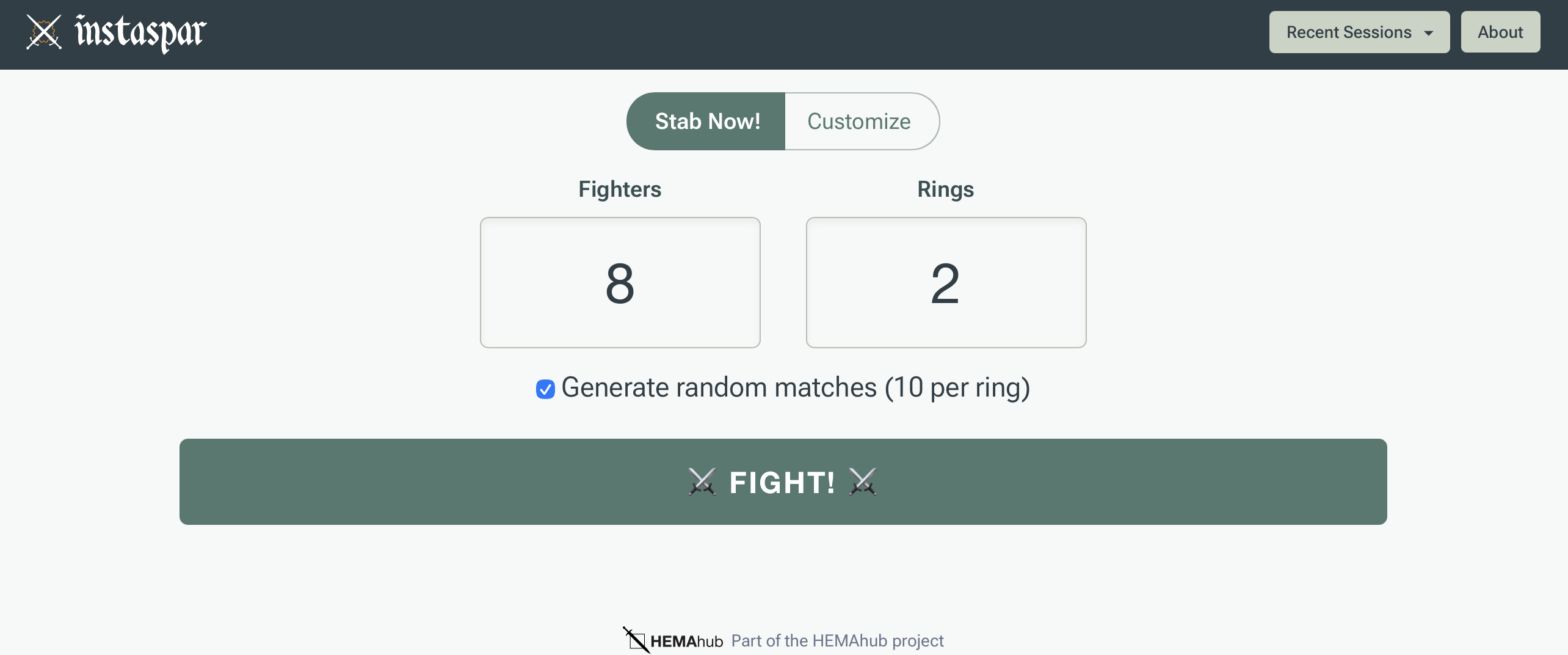 Instaspar is a sparring queue manager built for Historical European Martial Arts (HEMA) clubs. Spin up a sparring session on the fly, queue bouts across multiple rings, and keep results around to share with your club afterwards.